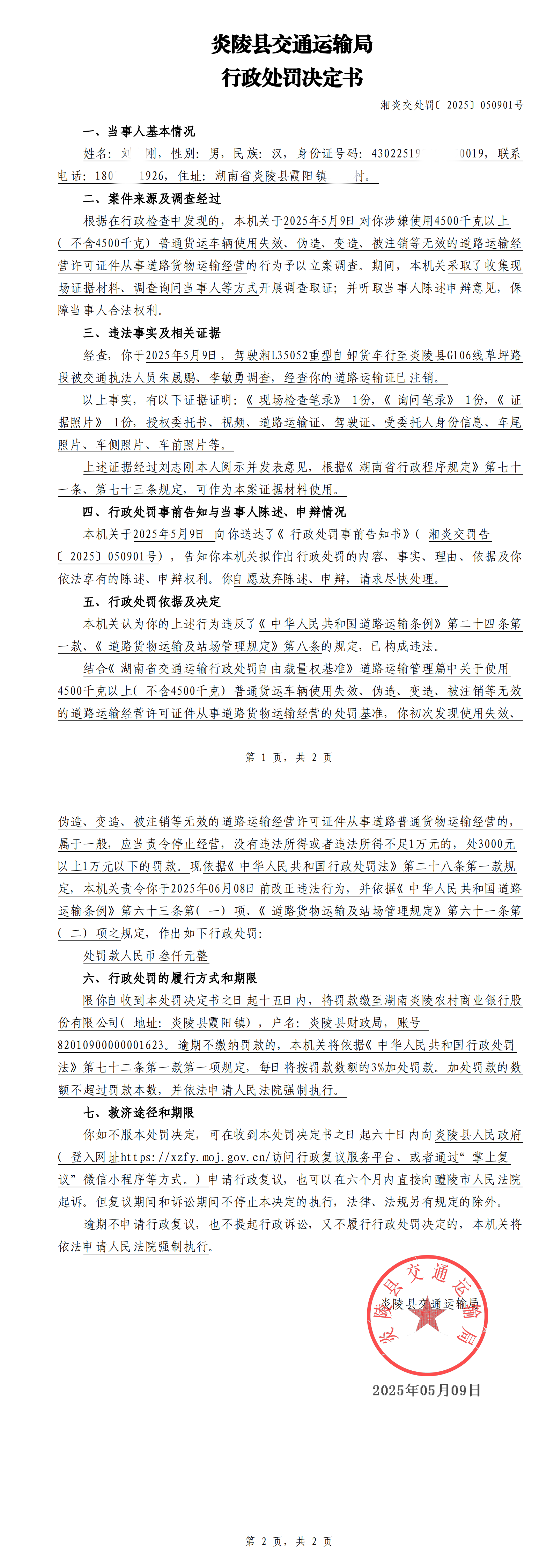 炎陵县交通运输局行政处罚决定书湘炎交处罚〔2025〕050901号