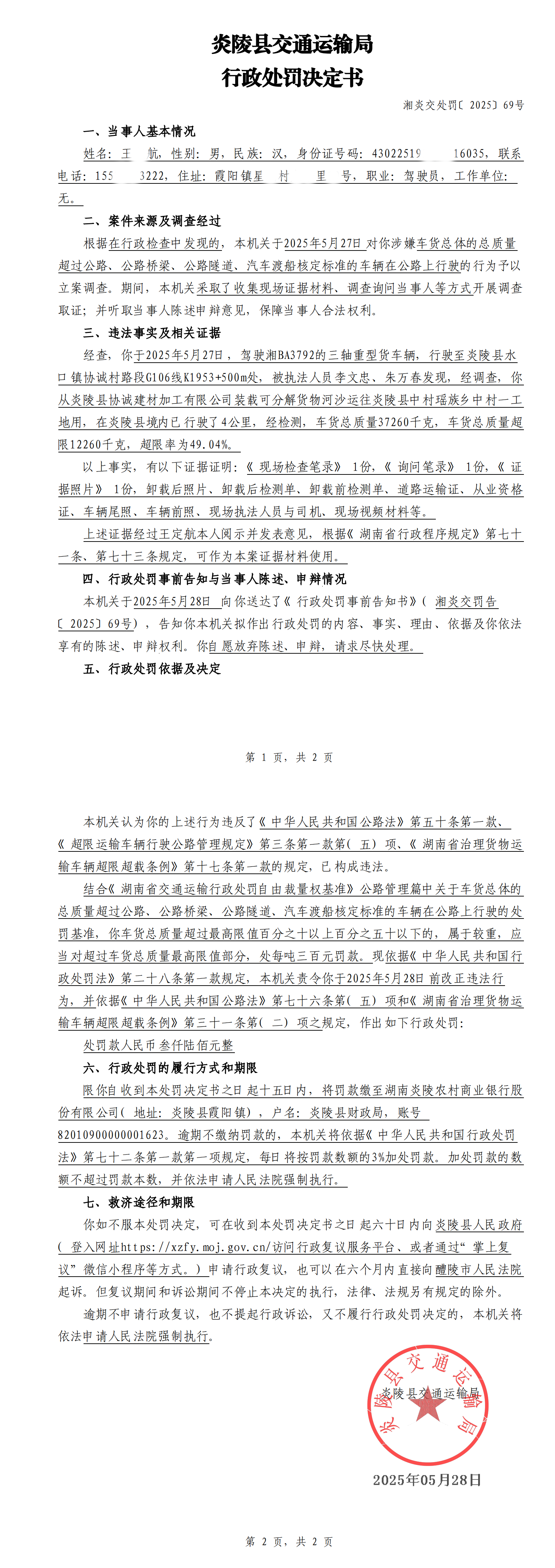 炎陵县交通运输局行政处罚决定书湘炎交处罚〔2025〕69号