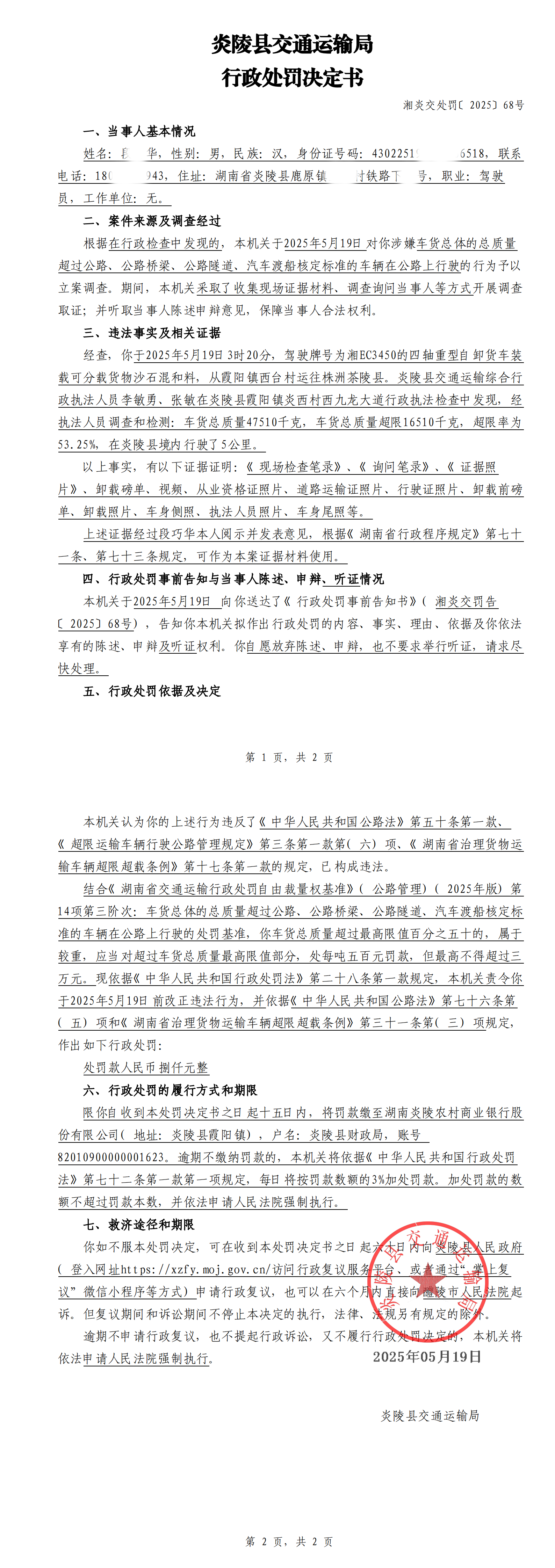 炎陵县交通运输局行政处罚决定书湘炎交处罚〔2025〕68号