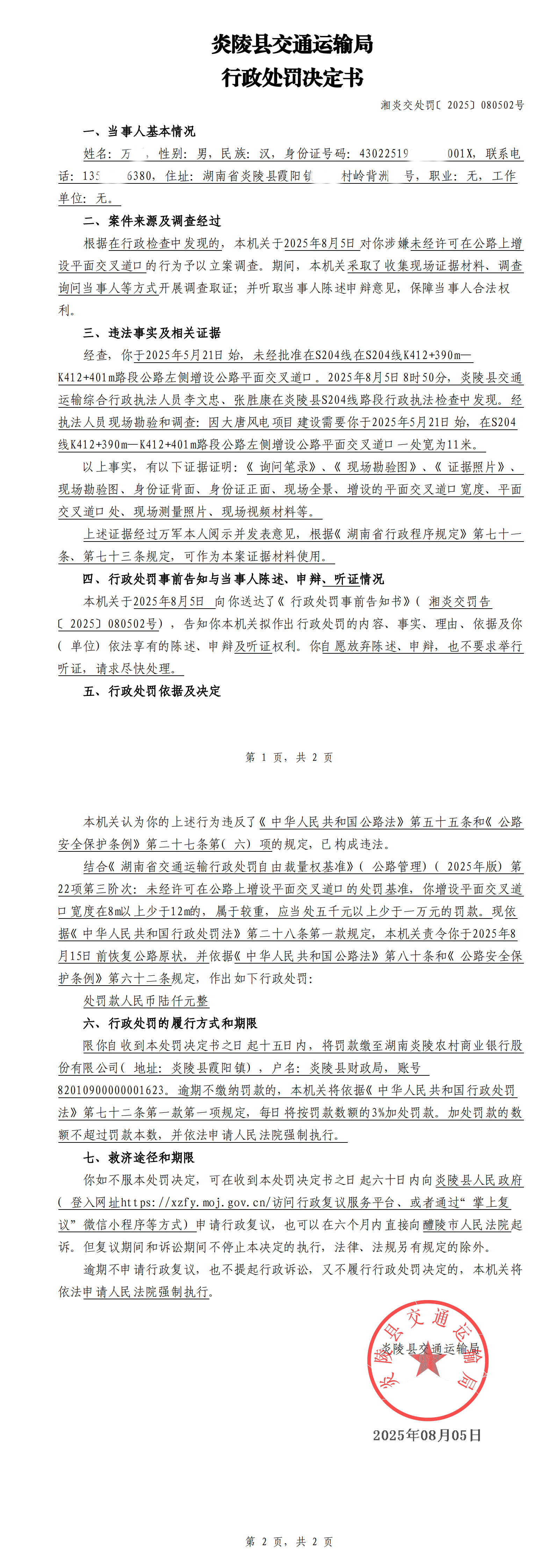 炎陵县交通运输局行政处罚决定书湘炎交处罚〔2025〕080502号