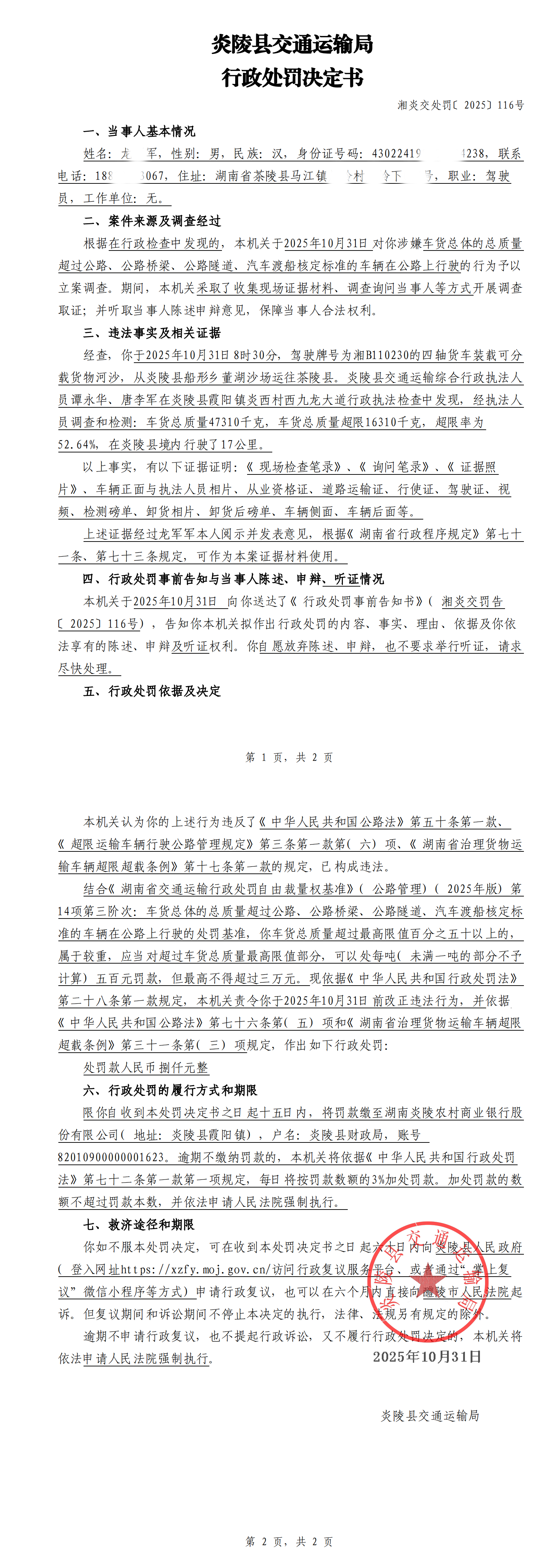 炎陵县交通运输局行政处罚决定书湘炎交处罚〔2025〕116号