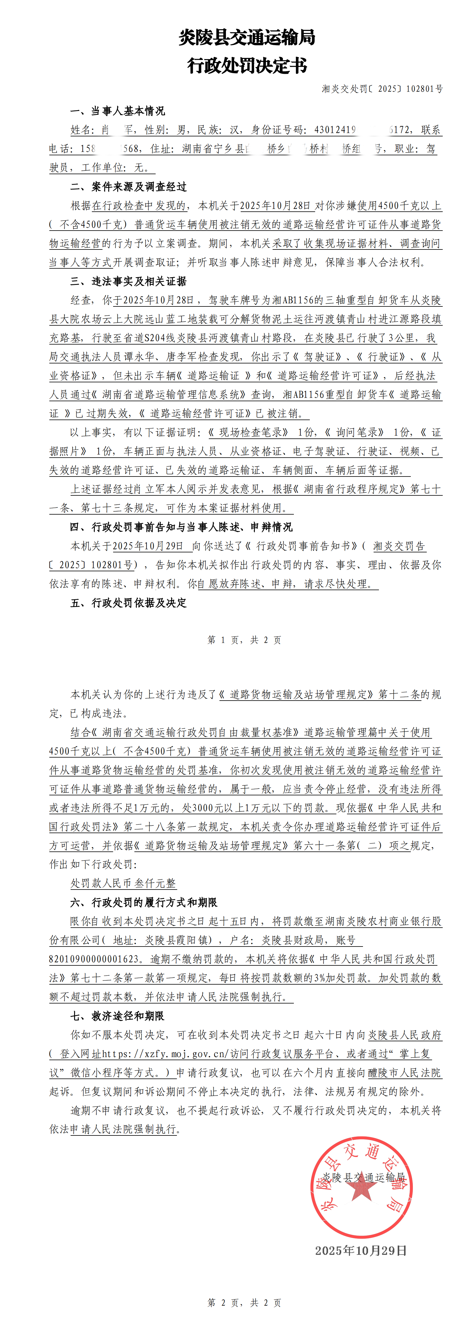 炎陵县交通运输局行政处罚决定书湘炎交处罚〔2025〕102801号