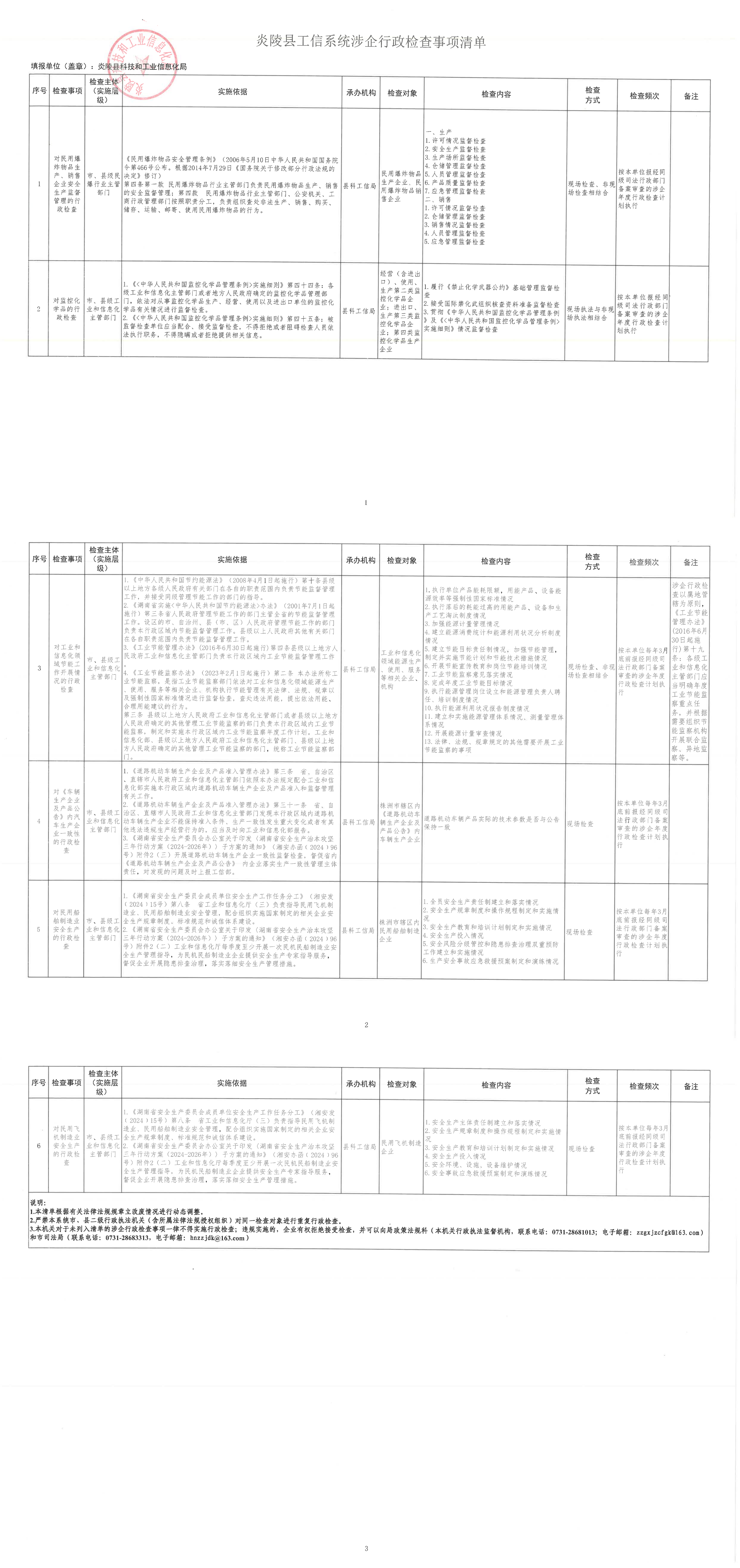 炎陵县工信系统涉企行政检查事项清单