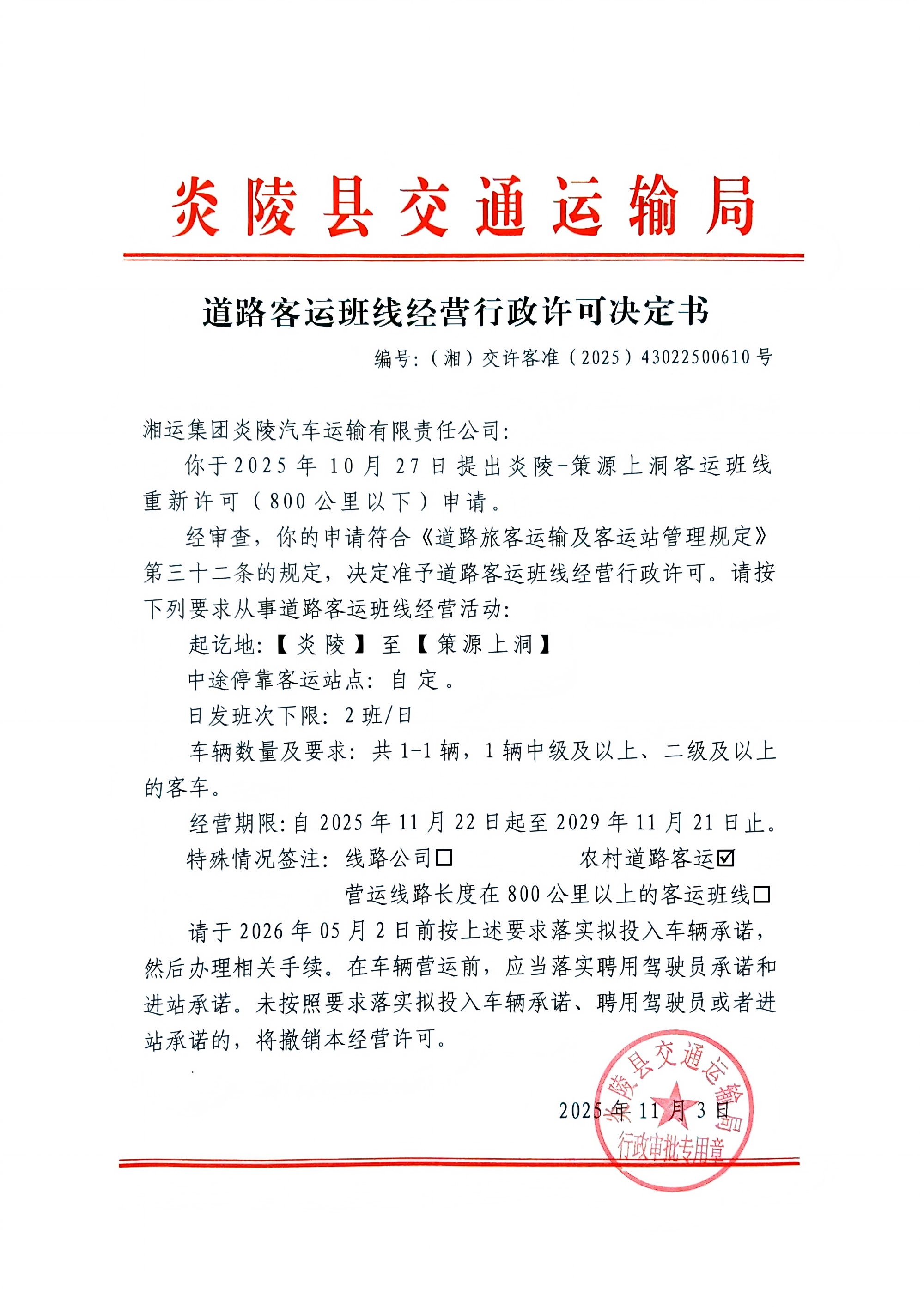 炎陵县交通运输局道路客运班线经营行政许可决定书(湘)交许客准〔2025〕43022500610号